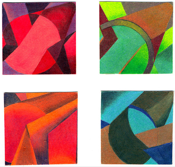 An exercise in applying color theory to abstract shapes. Colored pencil, watercolor.