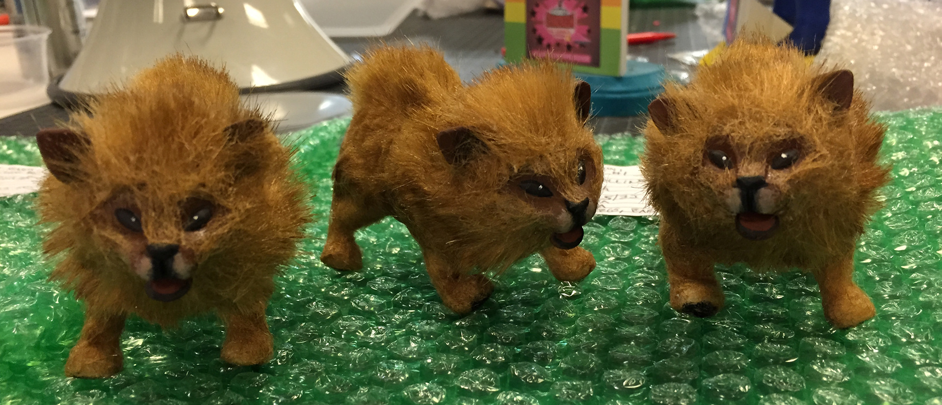 These guys are little chow dogs I made for SuperMansion. They have cast heads on little foam bodies originally meant for a cat, but I modified them. I did everything, from giving them quick armatures so they could animate to even giving them little flappy jaws so they could bark. The fur was fun to attach and shape.